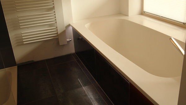 CORIAN° farbe Cameo White. In der Ansicht kaum zu erkennen, doch hinter den Türen links und rechts verbirgt sich eine Waschmaschine und ein Wäschetrockner. Keine Sonderanfertigungen, sondern ganz normale handelsübliche Standgeräte. |