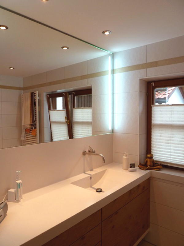 Spiegelschrank ist in die Trockenbauwand eingearbeitet. LED-Licht mit Leuchtkörpern aus Mineralwerkstoff. |